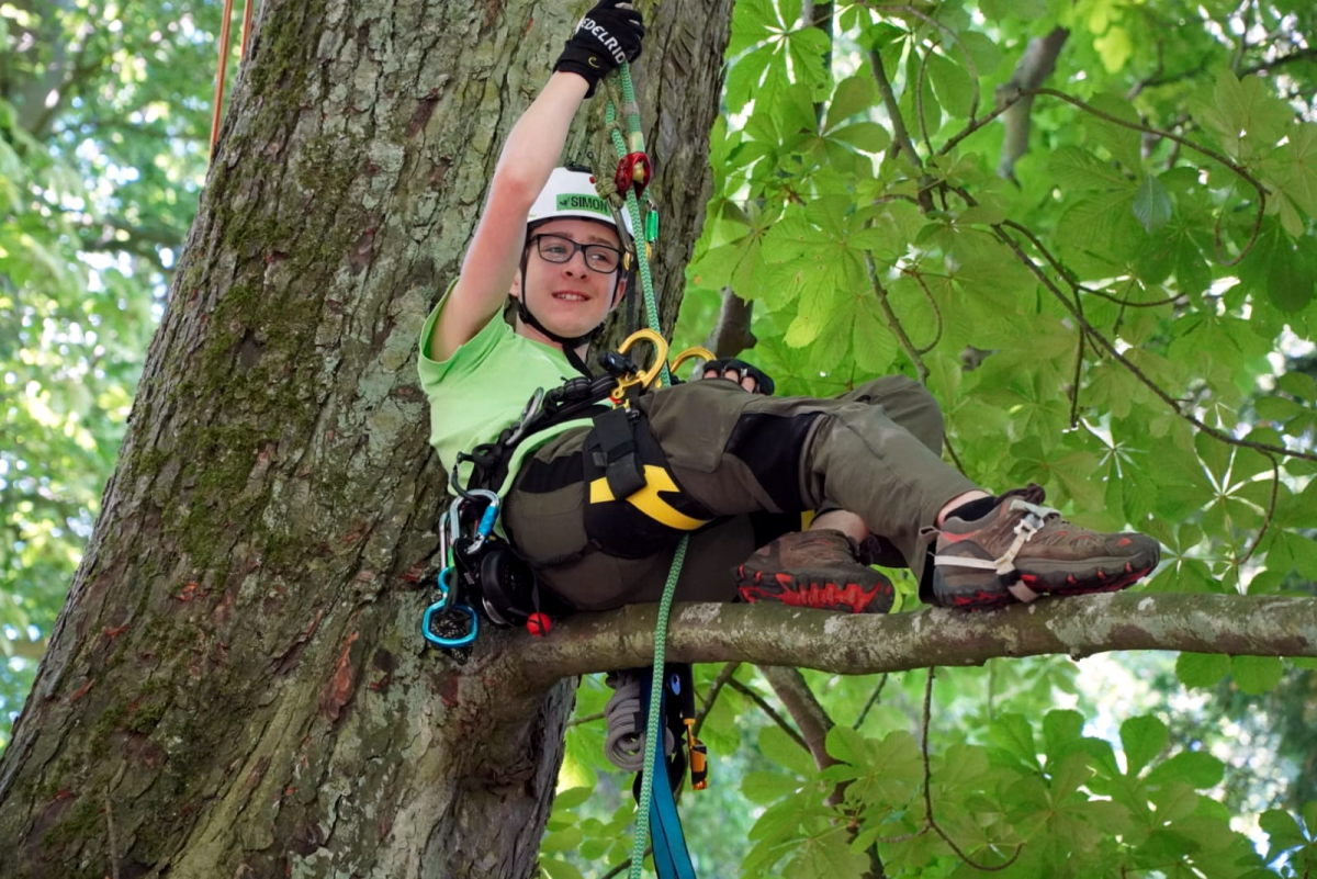 Während Moritz vom Boden aus den Überblick behält, begleiten die anderen die Klettergruppe im Baum. Zum x-ten Mal zeigen sie den Sicherheitsknoten und achten darauf, dass es allen gut geht. „So, in fünf Minuten kommt ihr bitte alle runter“, gibt Moritz das Kommando. Auch für die Baumbotschafter kommt Ablösung. „Wir wechseln uns ab“, kommentiert Helge (19), der mit Franziska (18), Jonathan und Simon (beide 14) die zweite Gruppe bildet. „Schließlich wollen wir auch die Wettkämpfe verfolgen.“